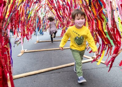 Kyber Cramer, 2, runs through The Wild Thang, a 60-foot-long paper mâché dragon, with his sister Catalina Cramer, 5, during a collaboration of Moscow’s Renaissance Fair and Farmers Market on Saturday morning.