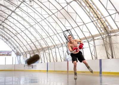 Despite rising temperatures throughout the Palouse, Derek Knox, of Moscow, takes in the heat as he practices taking shots on goal at the Palouse Ice Rink in Moscow on June 29, 2021. Knox, who has been playing hockey for over 25 years, including 10 years in the local men’s league, said he is most looking forward to Moscow’s new ice rink because “having a full sheet of ice will be nice for the nearby schools, but even better for the local kids.”