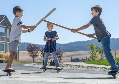 Eleanor Bremer, 6, watches as her brothers Silas, 8, left, and Matthew, 12, “sword fight” with scrap wood from the garage while riding on ripsticks in front of their Moscow home on Tuesday afternoon.