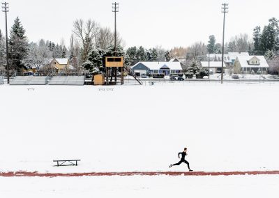 After clearing a lane of snow, Connor Horne, 14, runs short sprints around the Track at Moscow Middle School. Horne said he is preparing for the upcoming USATF National Youth Indoor Championship where he will compete in the 800 meter and 1500 meter distance running events. “I’m pretty motivated and I think I have a good chance at winning nationals,” added Horne.