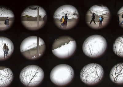 University of Idaho students are seen through a window of the Integrated Research and Innovation Center as they walk across campus on the first day of spring classes.