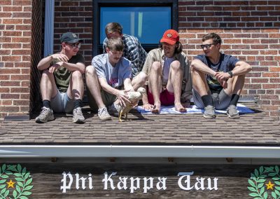 Members of University of Idaho’s Phi Kappa Tau enjoy the sunshine while sitting on the fraternity house roof with their pet duck, Quacker Oats, who members of the fraternity purchased in Lewiston just over a month ago. “Twelve dollars for a lifetime of happiness,” said fraternity member Ben Tompkins. As popularity of the new house pet grew, members decided to make an instagram page under the username “quackeroatsuidaho.”