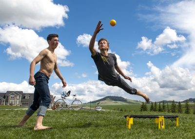 Nate Sanchez dives to keep the play alive during an intense match of spike ball with his brother Ethan, left, and friend Jack Landis, not pictured, at Indian Hills Park Tuesday afternoon in Moscow. The trio mentioned they were homeschooled and recently on summer vacation. “It’s pretty awesome to hang out with friends when school’s out,” Ethan Sanchez.