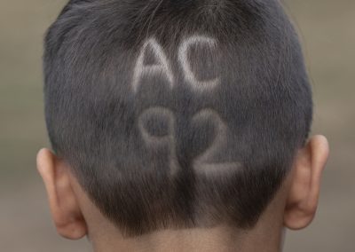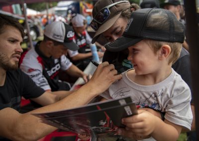 Three-year-old Trey Roberts of Coeur d’Alene, Idaho waits in line to get an autograph from racer Eli Tomac during the Lucas Oil Pro Motocross Championships at the Washougal MX Park on Saturday, July 27, 2019. (Zach Wilkinson/The Columbian)