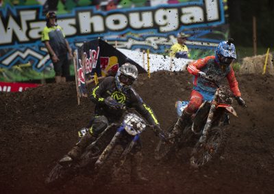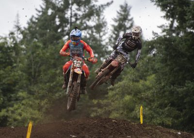 Riders Jacob Hayes, left, and Derek Drake fight for position in the 250 Class Moto #1 race during the Lucas Oil Pro Motocross Championships at the Washougal MX Park on Saturday, July 27, 2019. (Zach Wilkinson/The Columbian)